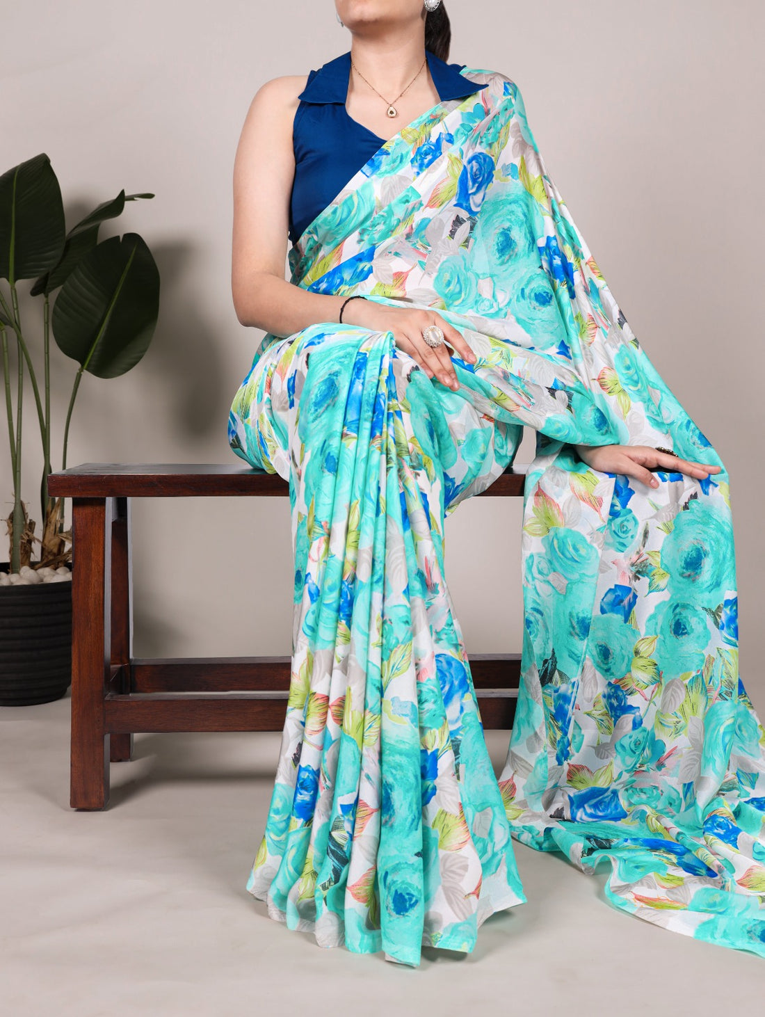 Aqua Blue Floral Printed Georgette Saree – Lightweight & Breezy