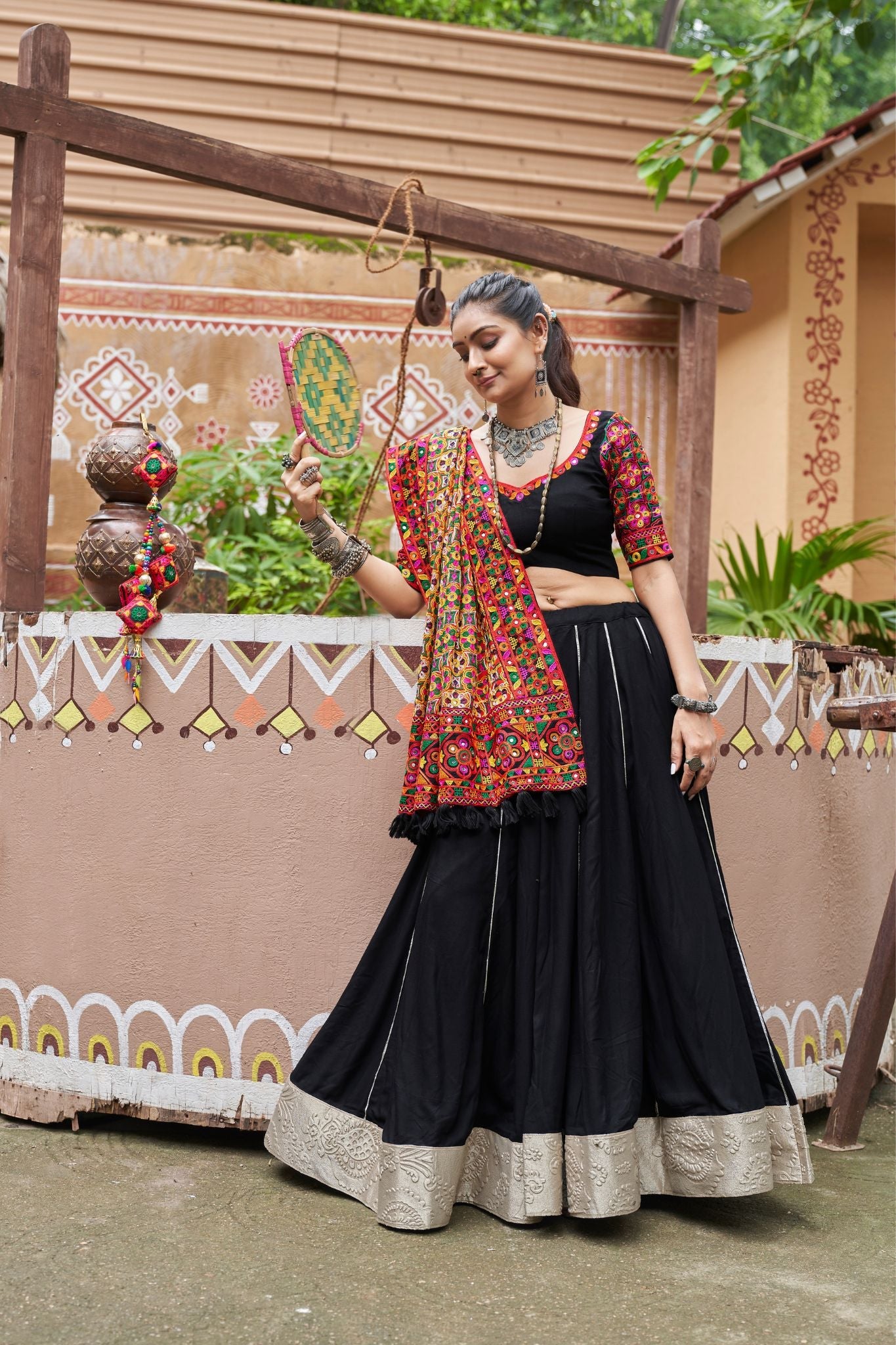 This Lehenga is making us go WOW for the festive season! This lehenga make is Viscose Rayon with Embroidery with Mirror work, and it is sure to bring out the glam girl in you. The black color is so popped up, and it will definitely turn heads wherever you go. Be it your friend's wedding, navratri, or a family function, style this one with statement jewellery to slay the event!