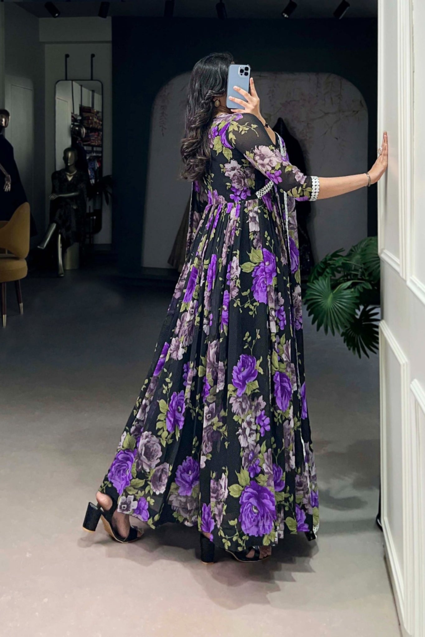 This elegant Anarkali gown is crafted from flowy georgette fabric, beautifully adorned with vibrant floral prints that exude grace and charm. The gown features a delicate Peper Mirror Lace touch-up along the neckline and borders, adding a subtle shimmer to the overall look. It comes with a full-length silk lining that ensures a smooth, comfortable fit from top to bottom.