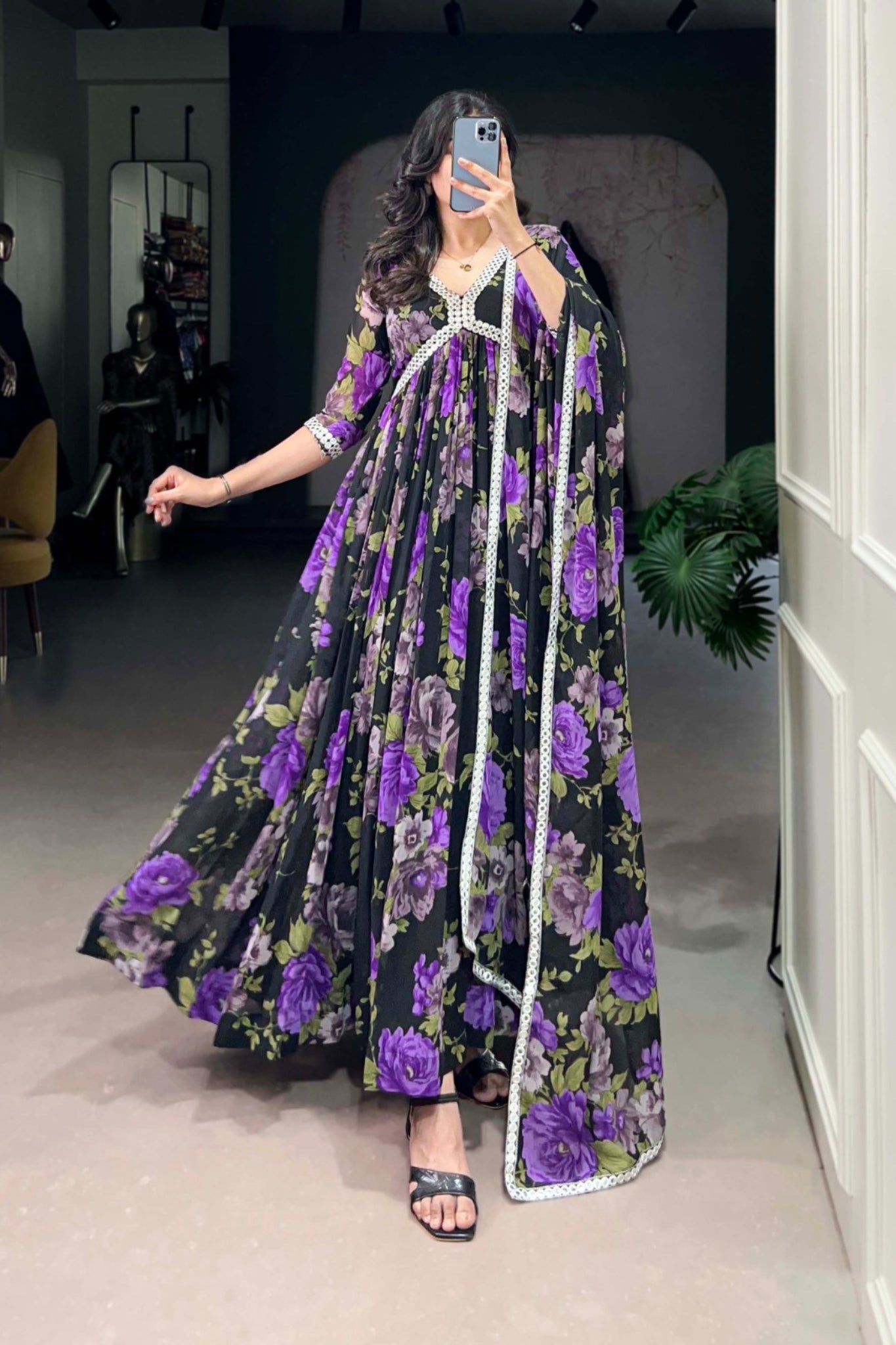 Accompanying the gown is a matching georgette dupatta, also detailed with coordinating floral prints and finished with a Peper Mirror Lace trim, perfectly tying the ensemble together with a touch of refined glamour. Ideal for festive occasions, weddings, or cultural celebrations, this outfit strikes the perfect balance between tradition and modern elegance.
