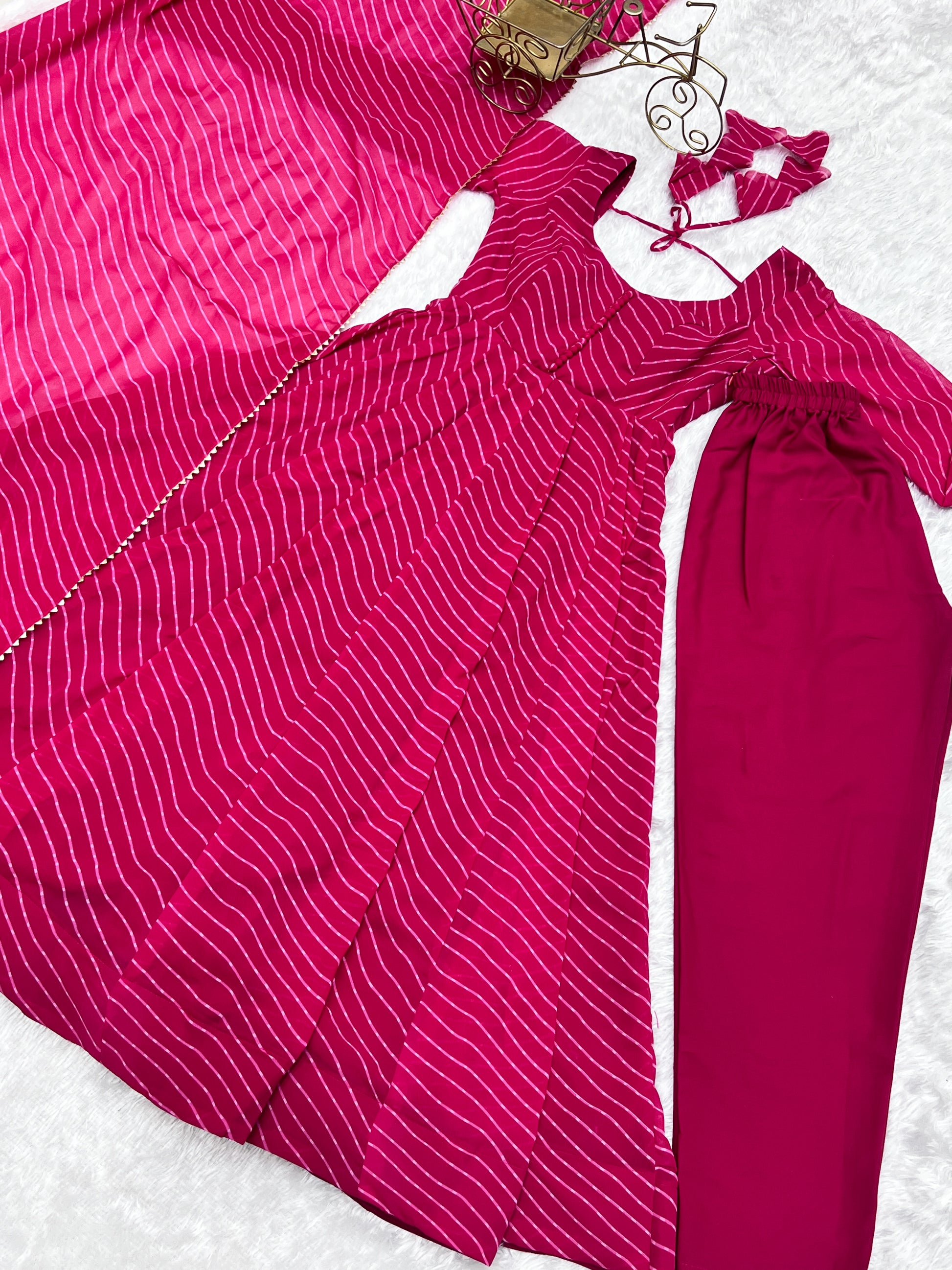Our stunning pink laheriya printed georgette anarkali pant suit with dupatta is a must-have piece for any ethnic wear lover. With its beautiful color, luxurious fabric, and intricate detailing, this pantsuit is a standout choice for special occasions. Shop now and elevate your ethnic wear collection with this exquisite ensemble from Ethnic Plus.