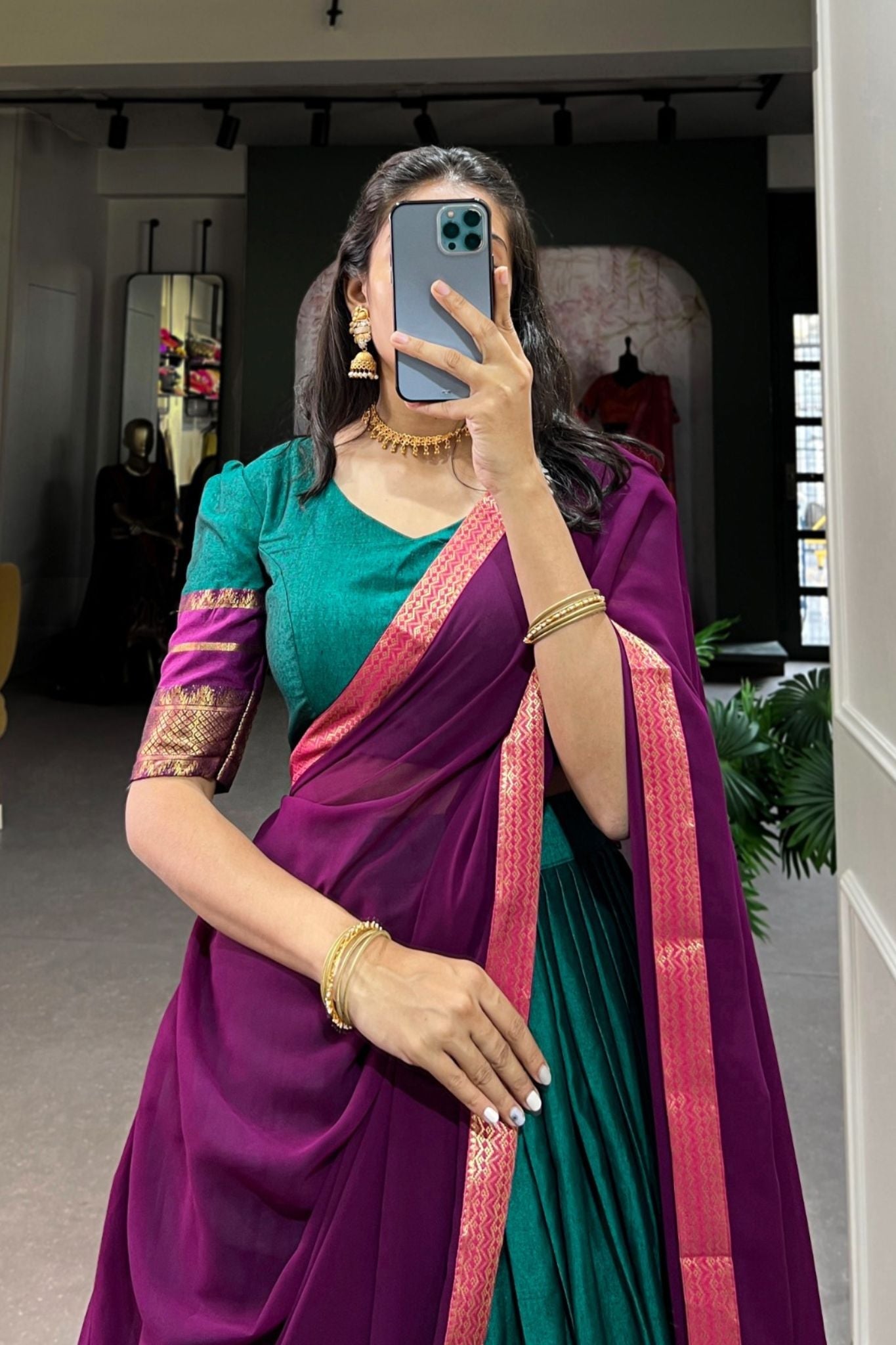 These stunning lehengas showcase a beautiful fusion of vibrant colors and rich traditional elements, perfect for festive occasions like Puja or weddings. The outfits feature intricate zari borders, gold accents, and luxurious dupattas that contrast elegantly with the skirts. Whether it's the royal blue and gold combination, the bold green and purple pairing, the earthy olive and brown tones, or the striking magenta and green set, each ensemble exudes a regal charm. The puffed sleeves and blouse details add to their elegance, making them ideal for creating a grand statement at any traditional event.