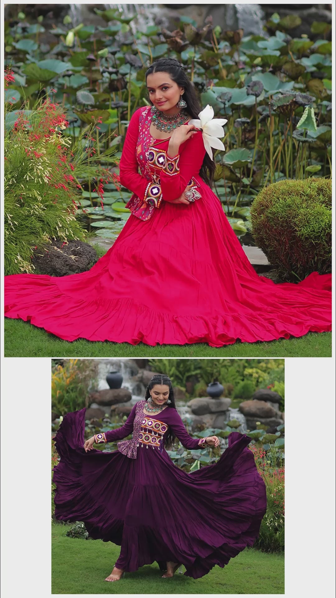 Get festive-ready with this stunning Wine Navratri Gown featuring traditional Kutchi patchwork, vibrant mirror work, and Bandhani-inspired prints. Made from soft, breathable rayon fabric, this gown offers all-day comfort with a statement ethnic look. The front yoke is designed with colorful handcrafted embroidery and a flattering peplum-style silhouette, giving it a modern twist. Long sleeves with detailed cuffs add a touch of elegance, while the flowy, tiered skirt is perfect for twirling during Garba and Dandiya nights. Whether you're celebrating at a community event or dancing the night away, this gown ensures you stand out with grace and tradition.