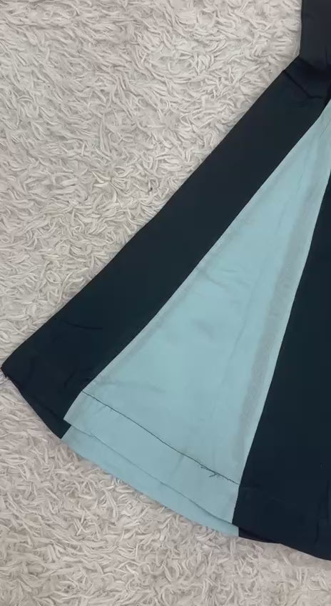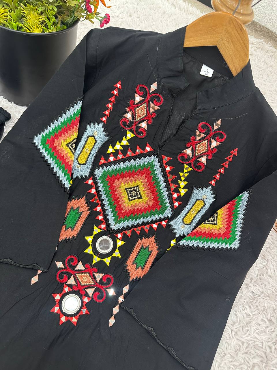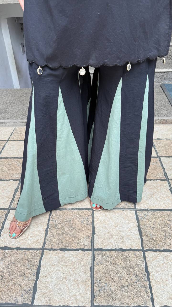 Bring vibrant energy to your festive celebrations with this stylish Navratri co-ord set. The black kurti is beautifully adorned with colorful embroidery and mirror work, giving it a traditional yet trendy vibe. Paired with flared green and black striped palazzo pants, this outfit offers comfort and flair for dancing the night away. Perfect for garba nights, festive parties, and cultural events, this co-ord set is designed to make you stand out with its bold colors and unique detailing. Pair it with oxidized jewelry and juttis for a complete festive look.