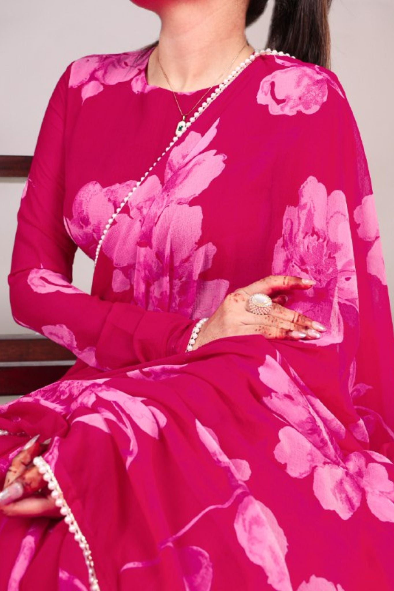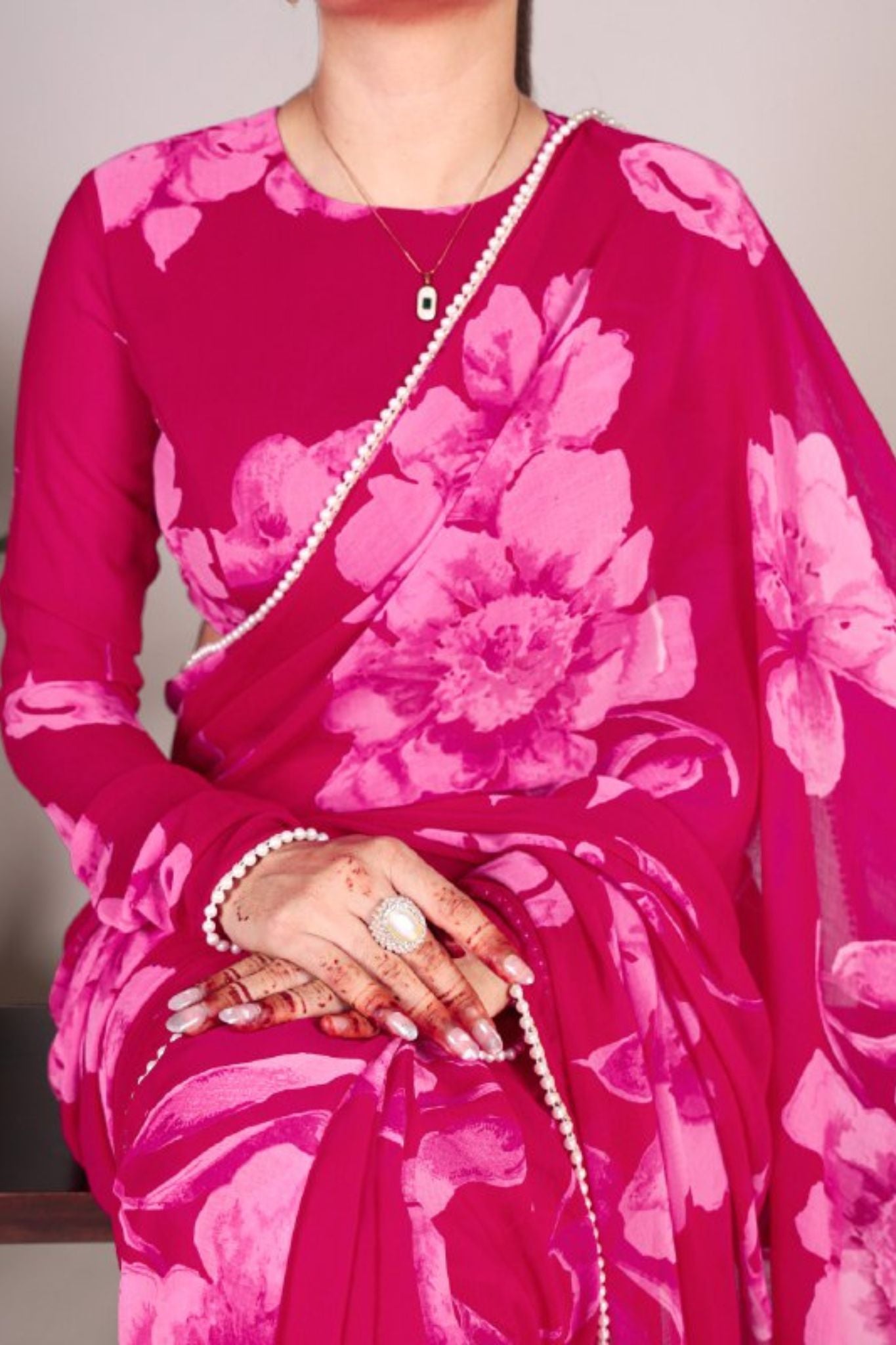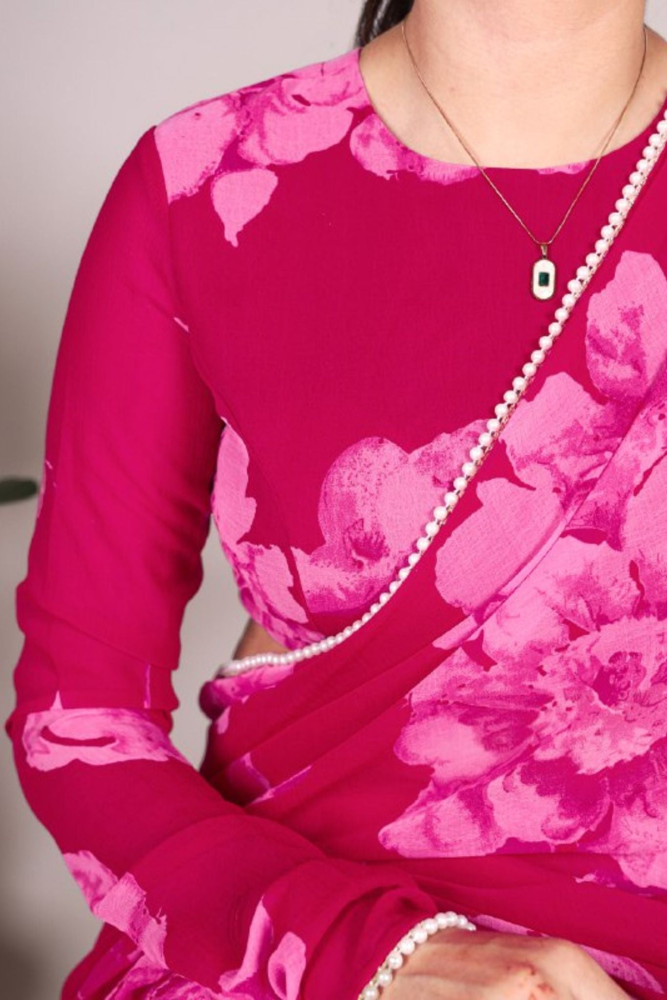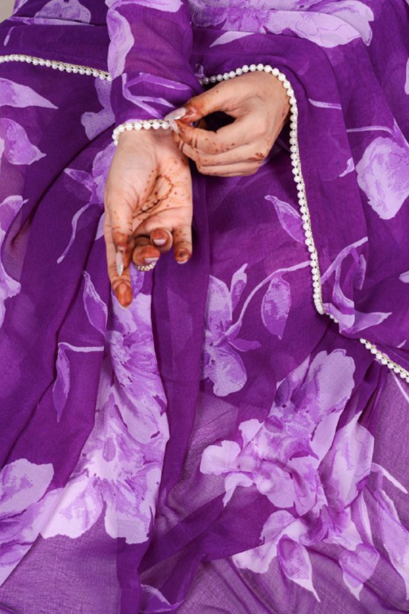 This exquisite purple, pink and blue floral printed saree is the epitome of elegance and sophistication. Crafted from a sheer, lightweight fabric, it drapes beautifully, creating an ethereal silhouette. The delicate pearl lace border enhances its charm, making it perfect for festive occasions, weddings, and formal gatherings. Paired with a matching full-sleeve blouse, this ensemble radiates timeless beauty. Style it with minimal jewelry for a refined and regal look.