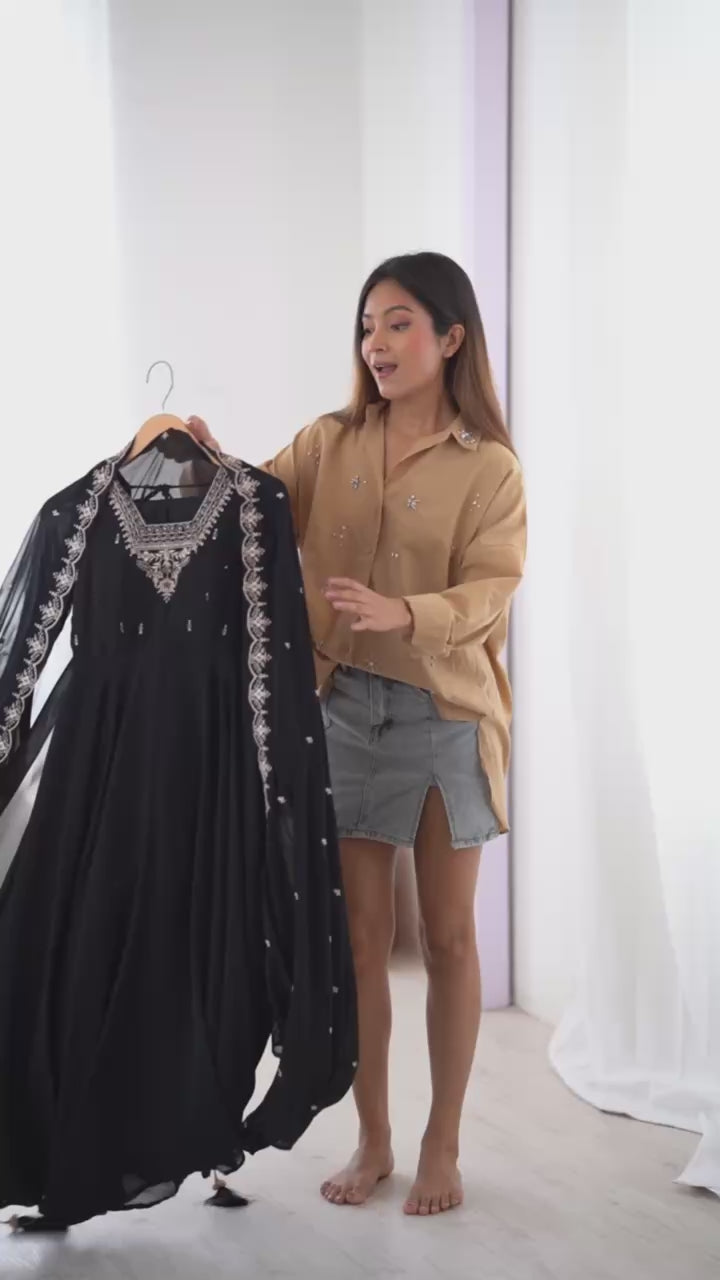Make a bold and elegant statement with this majestic black georgette anarkali suit, designed to dazzle at any celebration. The top features fancy embroidery with intricate bead and zari work, adding a touch of regal charm to the rich black fabric. This detailed craftsmanship brings both texture and sparkle, making it ideal for weddings, festivals, or party wear. With a generous 6.5-meter flair and a 48-inch top length, the anarkali creates a beautiful, flowing silhouette that flatters every movement. The soft georgette fabric enhances its graceful drape, offering both comfort and sophistication for long festive events. The look is completed with a plain scrape cotton pant, adding balance and breathability to the ensemble. A matching georgette dupatta with similar embroidery ties the outfit together, adding a refined, coordinated finish that elevates your entire look. This ready-to-wear suit is available in sizes S to XXL, making it accessible and stylish for all body types. Whether you're attending a grand wedding, a festive family gathering, or a stylish evening party, this anarkali suit offers elegance, comfort, and timeless charm.