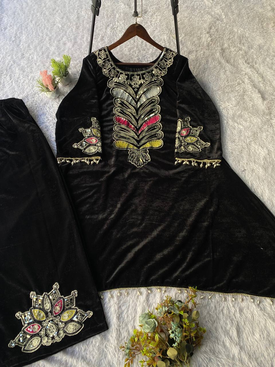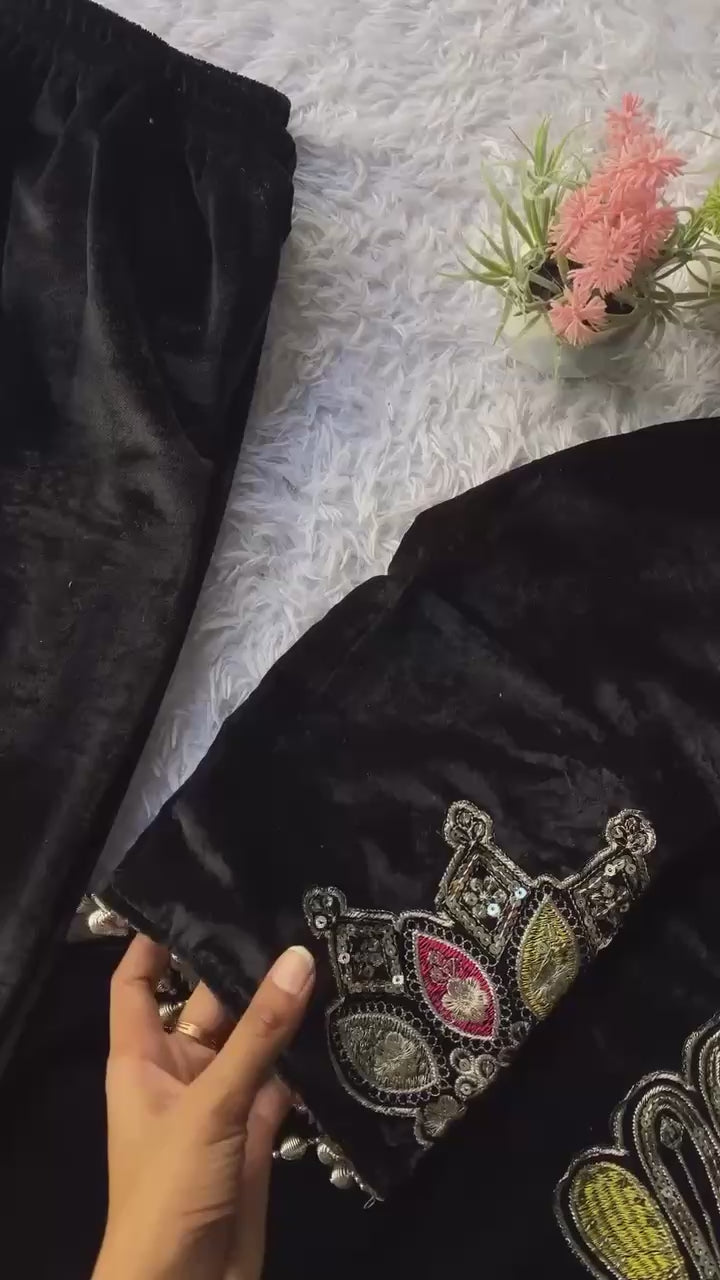 👉🏻 FABRICS & WORK:-VELVET WITH SEQUENCE EMBROIDERY PATCH WORK ON NECK AND SLEEVES