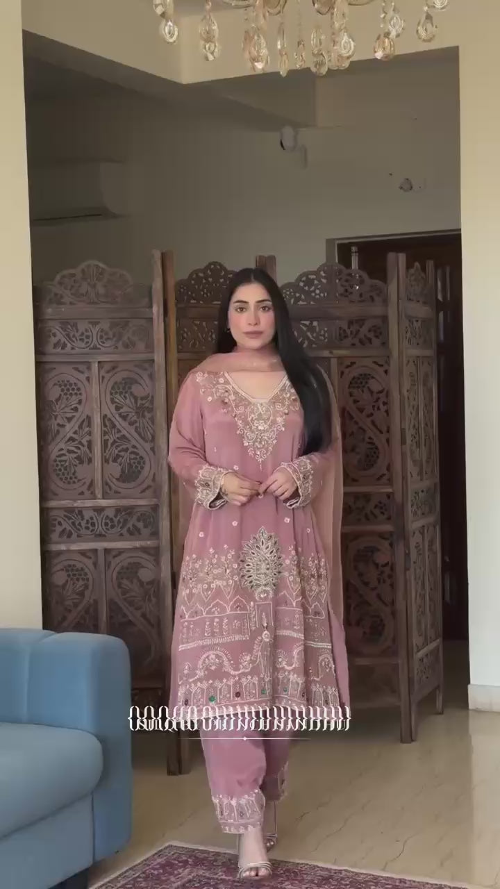 Turn heads with this exquisite rose pink embroidered suit set, crafted for elegance and charm. The kurta is beautifully adorned with intricate thread and sequin embroidery in white and green accents, creating a royal touch. Paired with matching embroidered trousers and a sheer dupatta, this ensemble is perfect for festive celebrations, weddings, and special gatherings. The rich fabric drapes gracefully, offering both comfort and luxury in every wear.