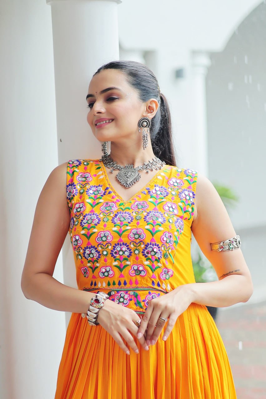 Perfect for festive occasions, traditional functions, or sangeet nights, this gown blends heritage craftsmanship with contemporary style effortlessly. Its intricate detailing and flowy silhouette make it a standout ensemble.