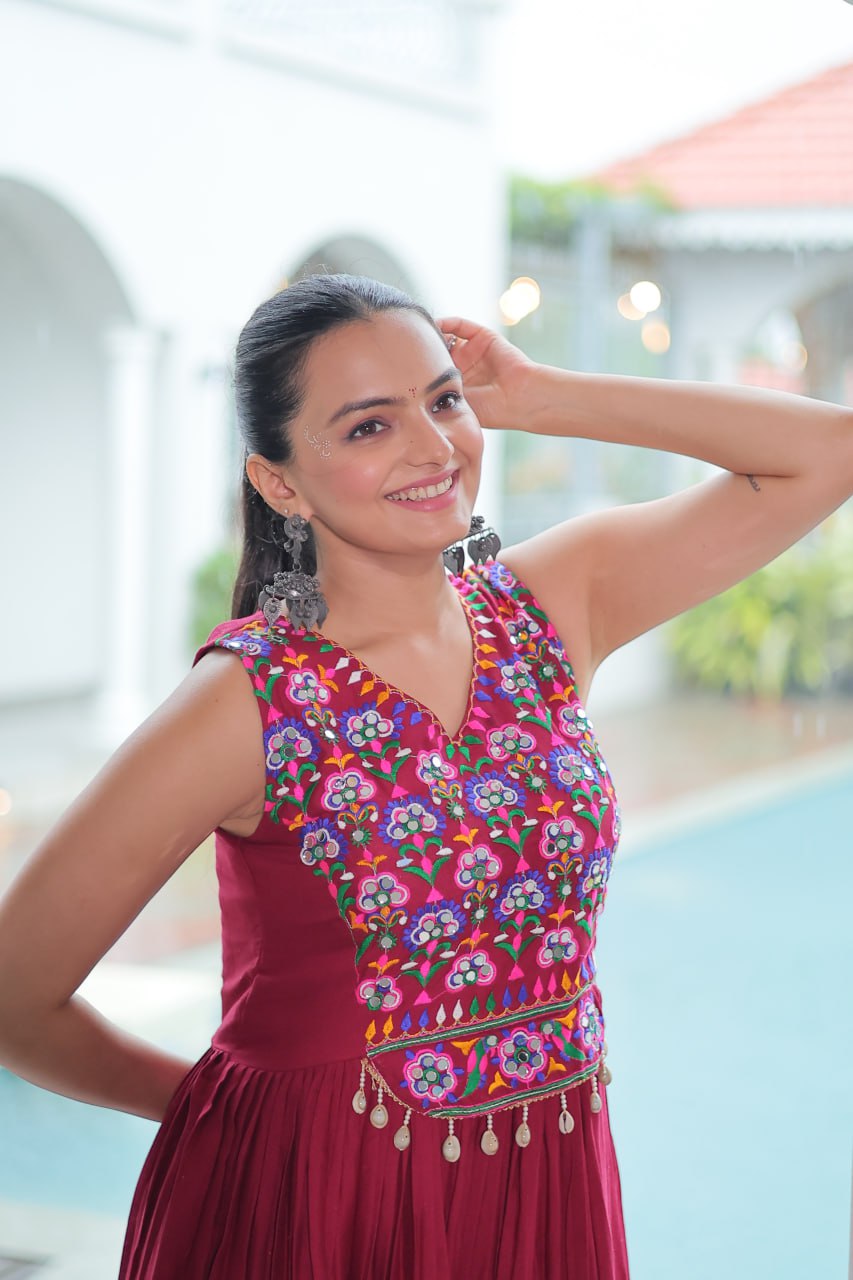The maroon gown is beautifully crafted in rayon fabric, adorned with intricate Kutchi Gamthi thread embroidery and delicate mirror work. Its vibrant embroidered yoke adds a festive charm while the subtle shell tassels enhance the ethnic elegance.