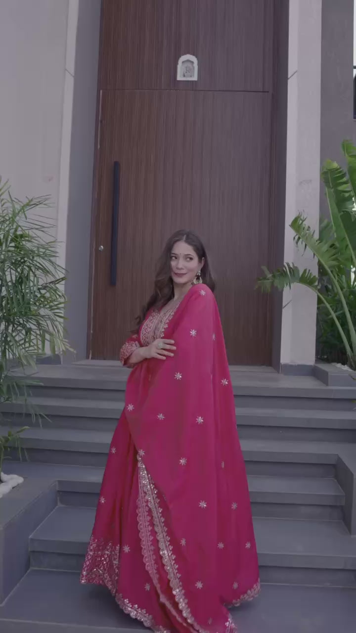 Make a graceful statement with this stunning rani pink Anarkali suit set, crafted for timeless elegance. The Anarkali features rich golden embroidery with delicate sequin detailing on the neckline, sleeves, and hem, adding a royal festive charm. The flowing silhouette enhances movement, while the matching embroidered dupatta completes the look with refined sophistication.Β Perfect for weddings, festive celebrations, parties, and special occasions, this outfit blends traditional artistry with modern grace.