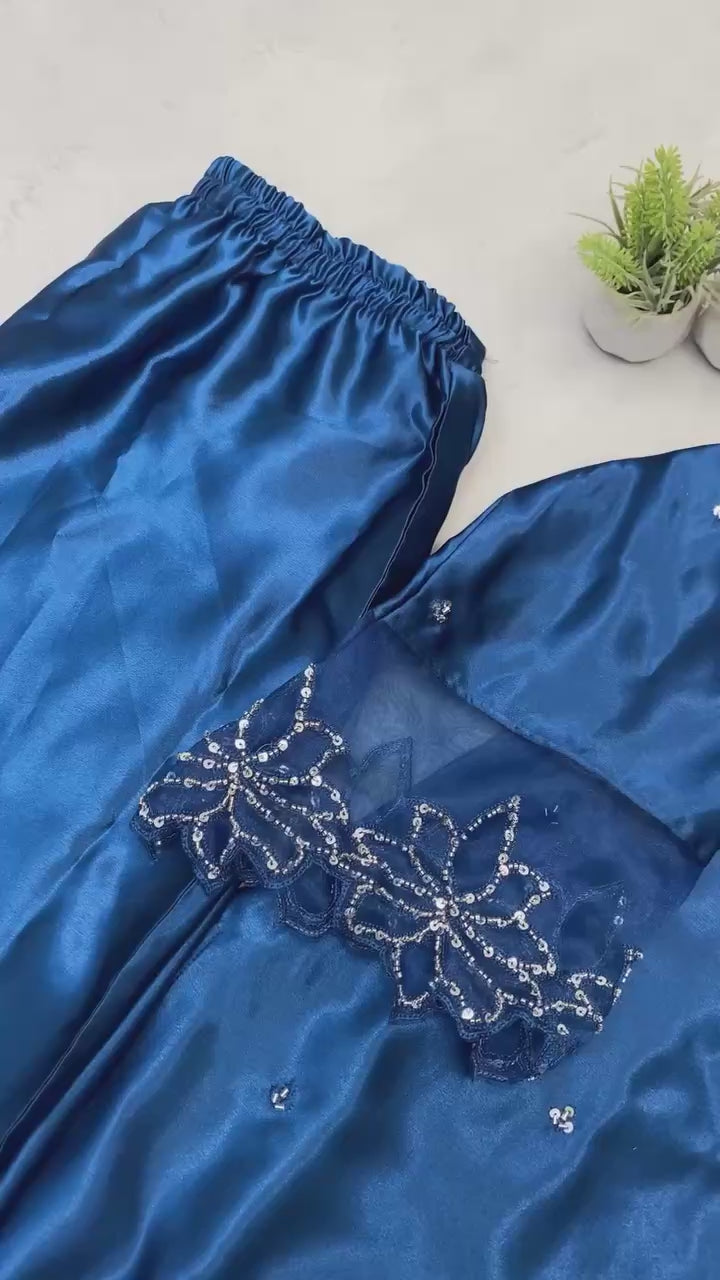 Elevate your ethnic wardrobe with this elegant rose-pink silk suit set, designed for effortless grace and comfort. The straight-cut kurta features a beautiful hand-embellished neckline and subtle stone work scattered across the fabric for a soft, luxurious shimmer. The sleeves are finished with delicate lace detailing, adding a refined feminine touch. Paired with matching silk pants and a lightweight organza dupatta featuring minimal embroidered accents, this outfit blends modern simplicity with classic sophistication. Perfect for festive gatherings, family functions, and elegant day events.